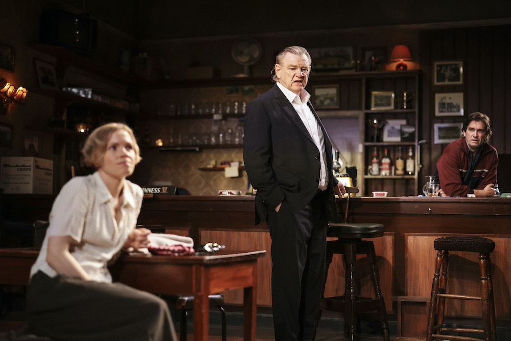 Kate Phillips plays Valerie with a soft touch that attempts to hide her feeling of being a newcomer. When she orders white wine, her normal Dublin drink, Brendan has to go into the main house to find an old bottle left over from some previous celebration, and when she needs the toilet he has to take her there because he’s never got around to building a ladies loo next to the pub room. When Phillips tells her story, the men become immobile, gripped and shocked by the awfulness of her experiences, and feeling the pain of her restrained but exceptionally moving tale. She’s also there at the end of the evening, sharing with Gleeson a brief moment of human connection — a great finishing touch to a production that is both haunting and brimming with emotional truth.
